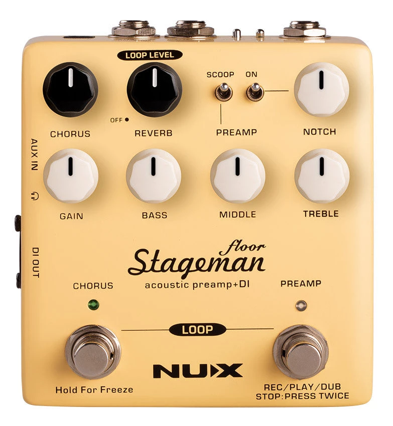 NUX Stageman Acoustic Amplifiers Natural Sound is now in a Pocket Size. NUX Stageman Floor is an analog acoustic preamp with digital effects and looper function. Preamp featured with a highly sensitive 3-band EQ with MID scoop toggle switch, adjustable notch filter and input gain control.
