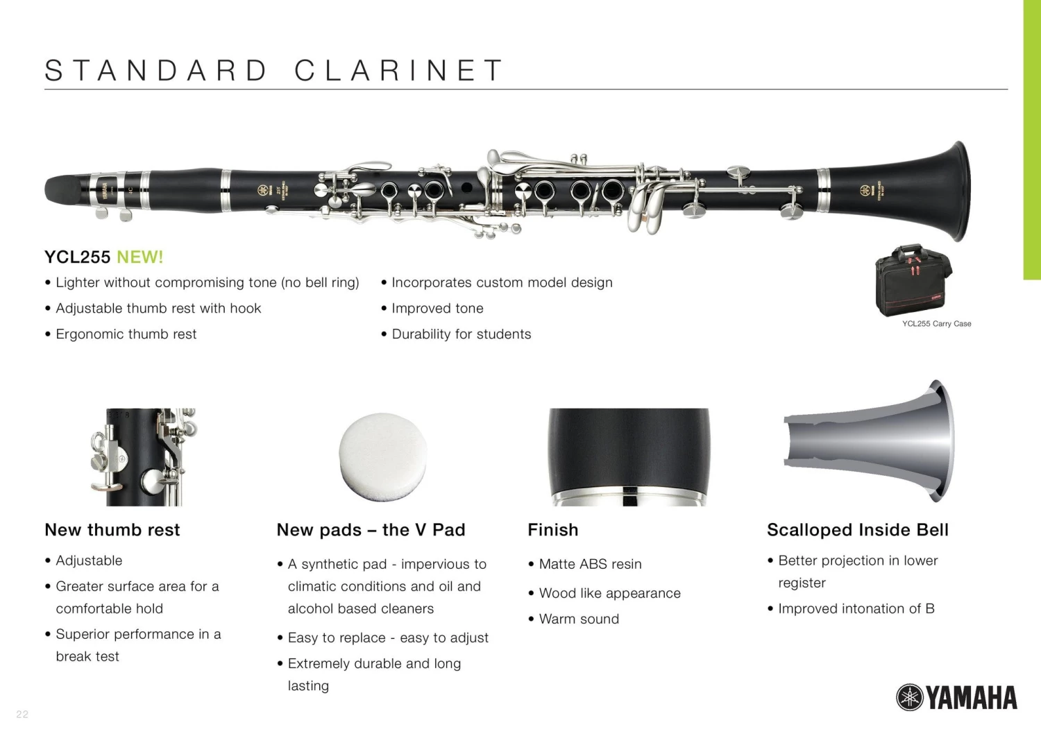 The YCL-255 combines state-of-the-art production expertise with high-end Yamaha clarinet features. The result is an outstanding entry-level instrument that delivers a warm, resonant tone that is remarkably similar to that of a wood clarinet. It features an ABS resin body with a matte finish that imitates that of a wood clarinet and an adjustable thumb-rest with a neck strap ring that allows for even those with small hands to easily hold the instrument.