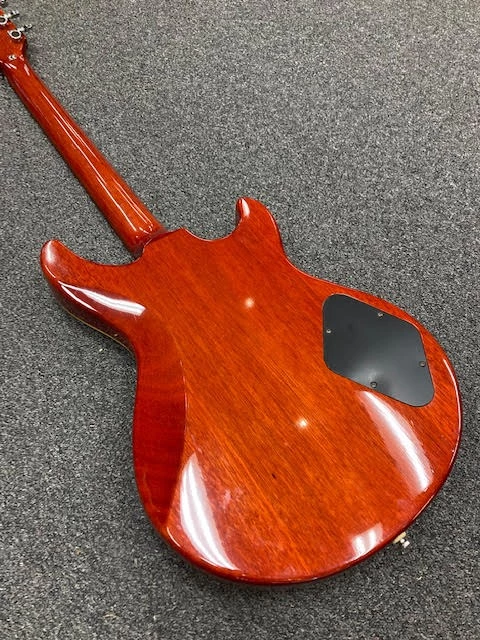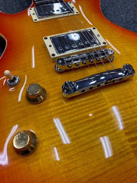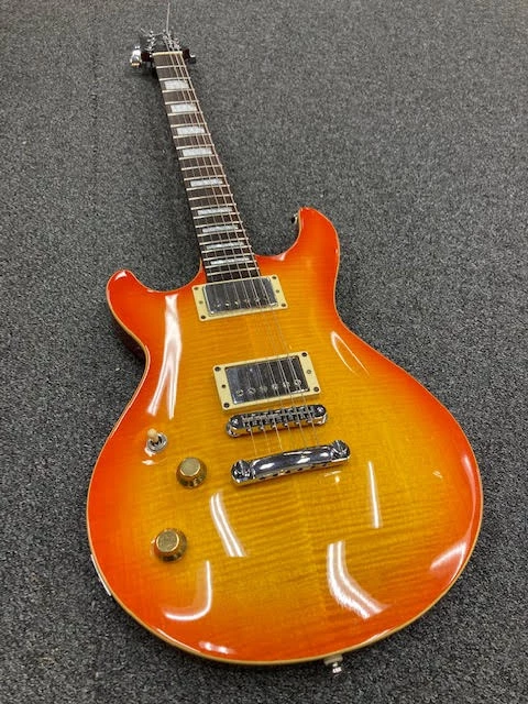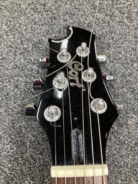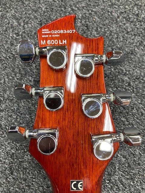 Just arrived is this Cort M600 LEFT HANDED electric guitar . Set neck with flamed maple top . Mahogany body , Humbucker pickups .