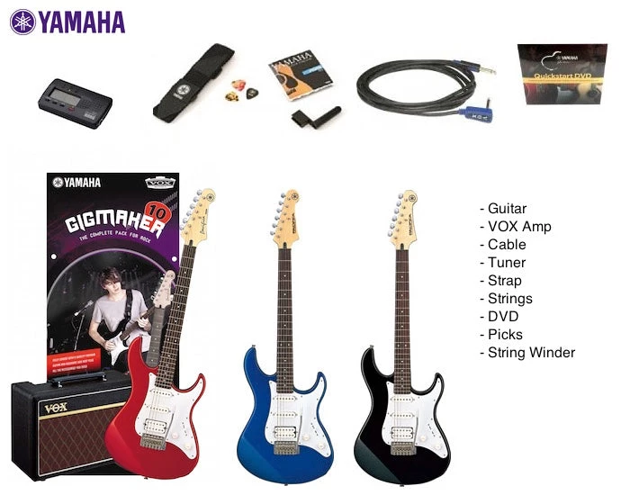 Everything you need to start playing is in this pack, including a great Yamaha PAC012 guitar and a hot VOX PATHFINDER10 amplifier as well as a VOX cable, Korg tuner, strings, picks, strap, string winder and learn-to-play DVD. Guitar in Red Metallic finish.