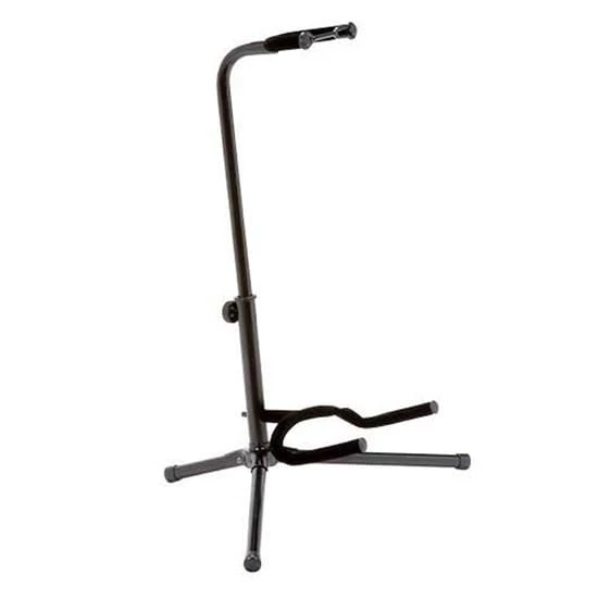 Tubular style heavy duty guitar stand with EVA foam rubber instrument protection for neck and body. Neck safety lock.