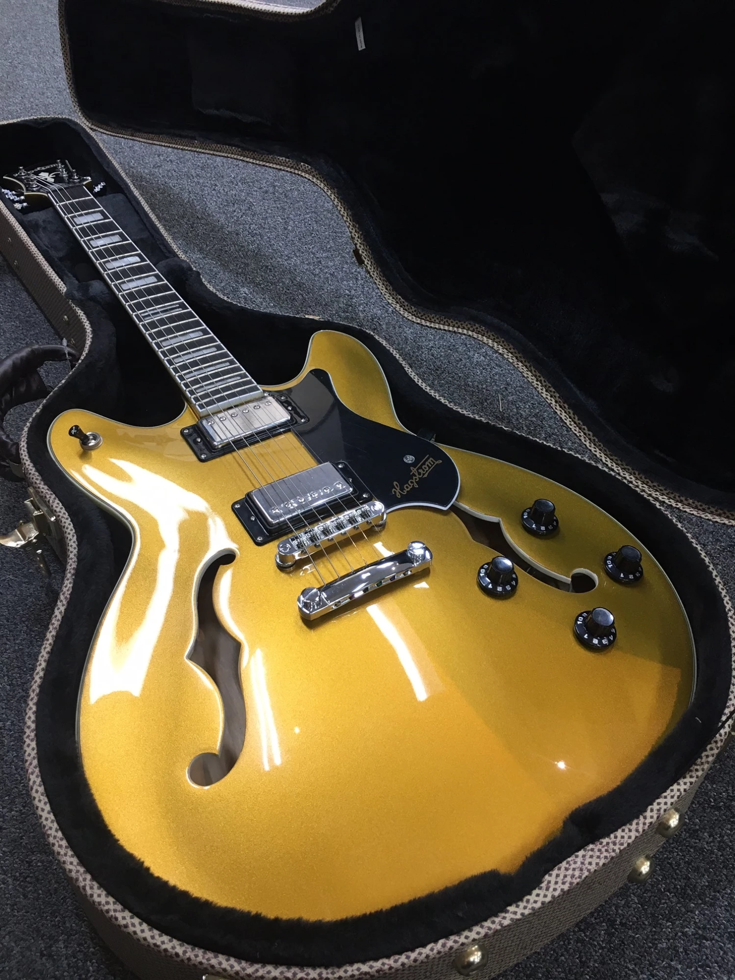 Justin’s Viking Gold Top starts with our classic Viking semi-hollow platform to which a classic vintage-style gold finish is applied. Justin loves Hagstrom’s thinner neck profiles, so we developed our “Ultra-Thin”, 17mm neck profile for his guitars. Vintage-style “witch hat” knobs, same as used on our RetroScape models, complete the “vintage vibe” this guitar oozes. A Hagstrom Custom 58 humbucking pickup in the bridge position provides classic rock tones, and when Justin wants to go slightly softer the HJ-50 humbucker in the neck position gets him there in smooth, elegant style. Individual coil-split is available via push/pull tone controls providing an expansive sonic palette.