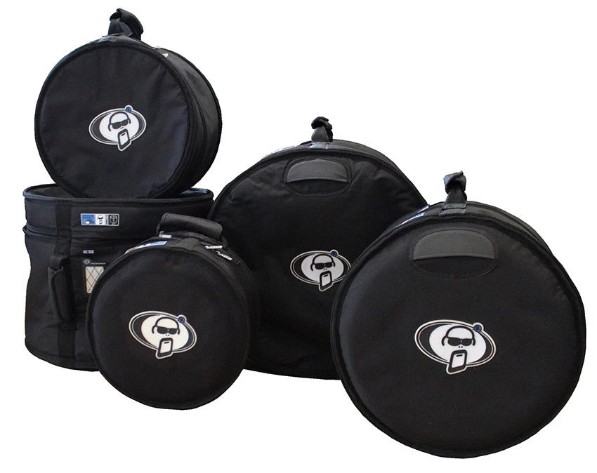 5-piece Protection Racket Proline drum case set to transport: 22″ x 18″ bass drum, 14″ x 6.5″ snare case, 14″ x 12″ floor tom case with Rims, 10″ x 8″ tom case with Rims, 12″ x 9″ tom case with Rims.