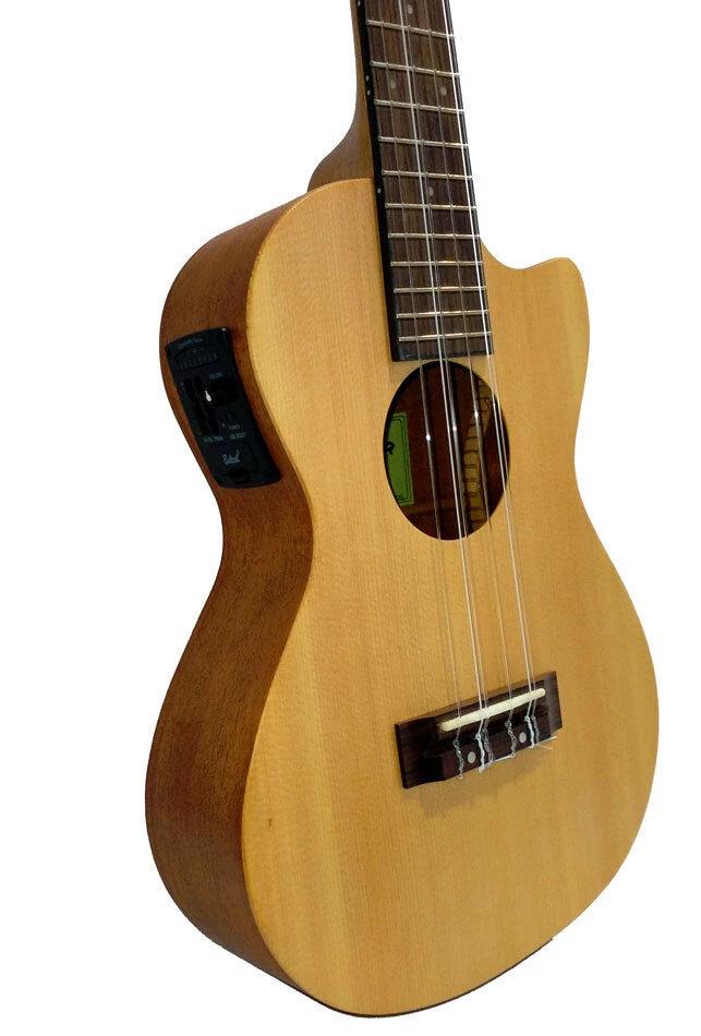 The Kealoha KS Series 6-String ukulele features a Solid Spruce Top with Mahogany back & sides in a Satin Finish, Great natural look with no binding or soundhole decoration, Chrome Kluson-style machineheads with butterbean chrome buttons, Rosewood fingerboard and bridge and is strung with Aquila strings and a Belcat UK300T preamp with onboard Tuner. There is also a cutaway to enable you to play your dream solos right up high on the fretboard so you will indeed be the envy of all your friends.