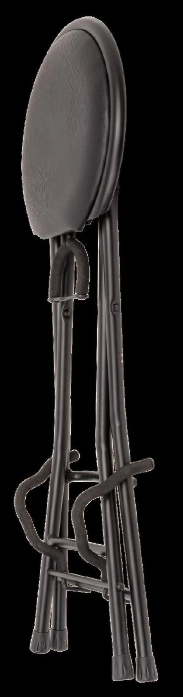 Integrated, hideaway guitar stand with EVA foam rubber instrument protection and neck safety lock.